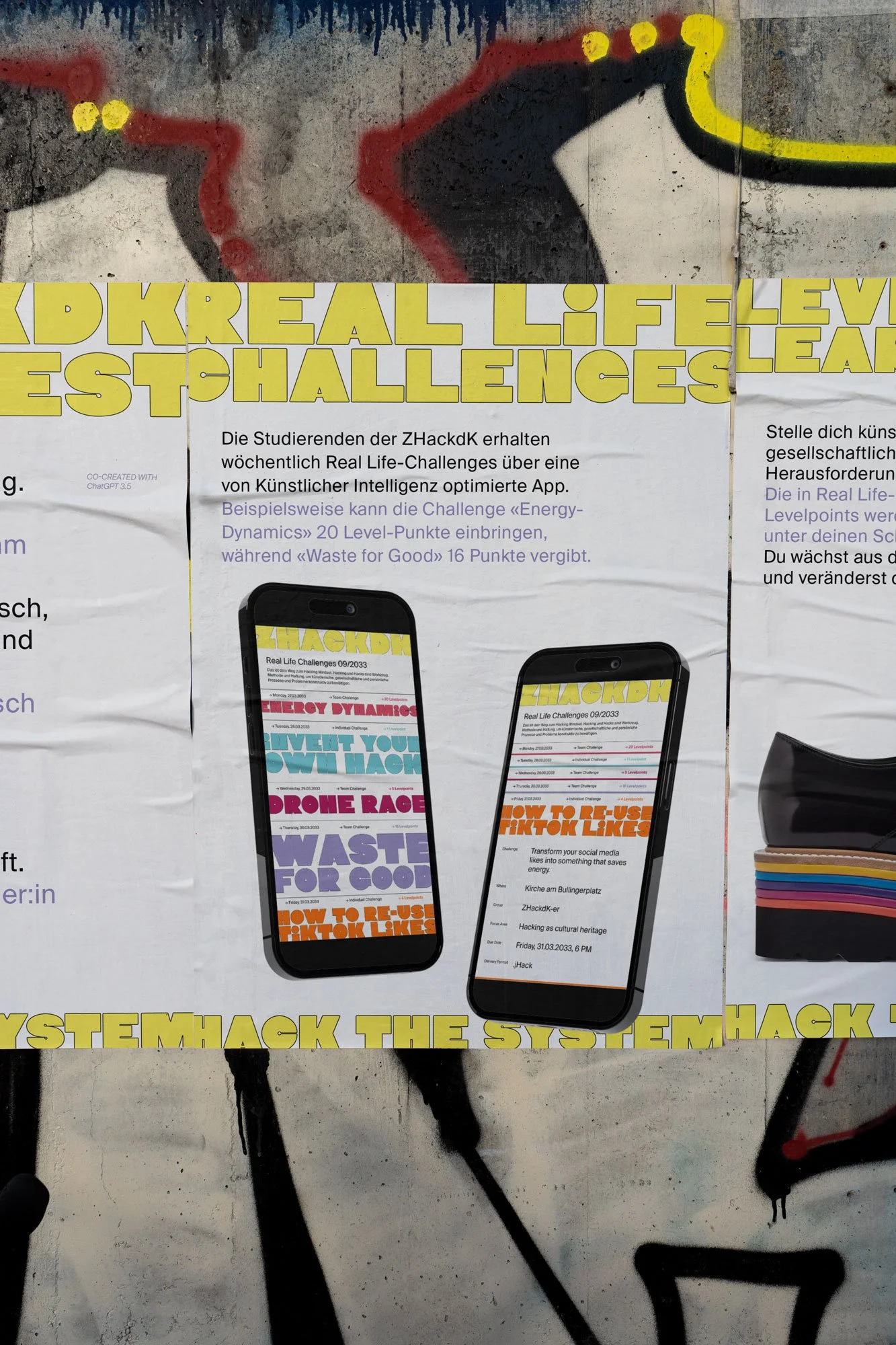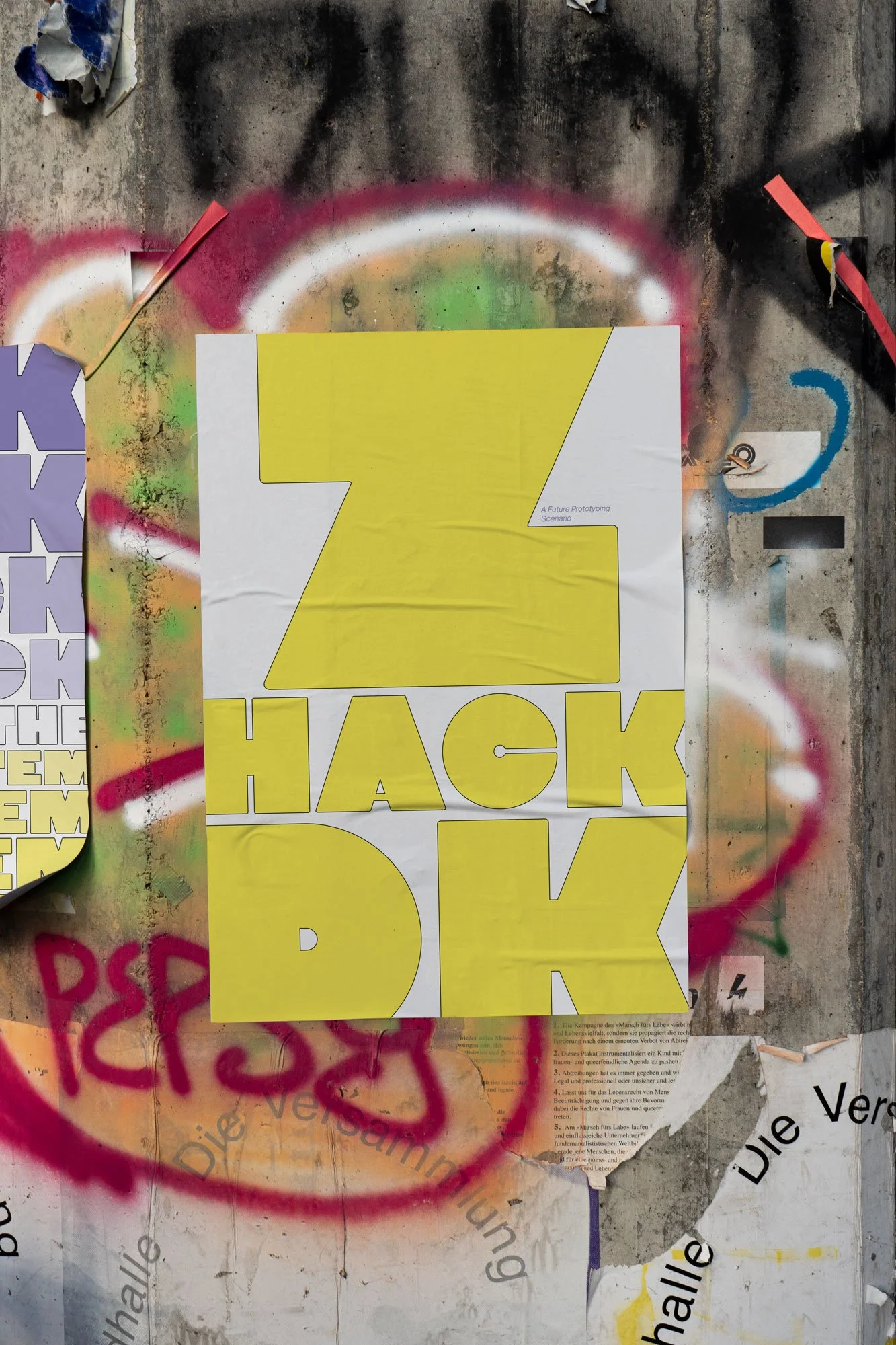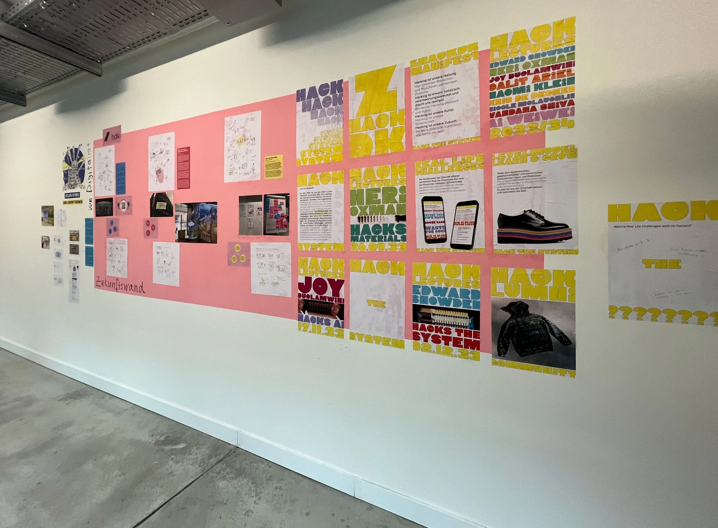 Dazu gehörten beim Szenario 3 “Z-Hack-dK” spekulative Designs wie die Lectures Series Ankündigungsposter aus dem Jahr 2033, die Real Life Challenges App oder der Hack-lumni Hoodie.
