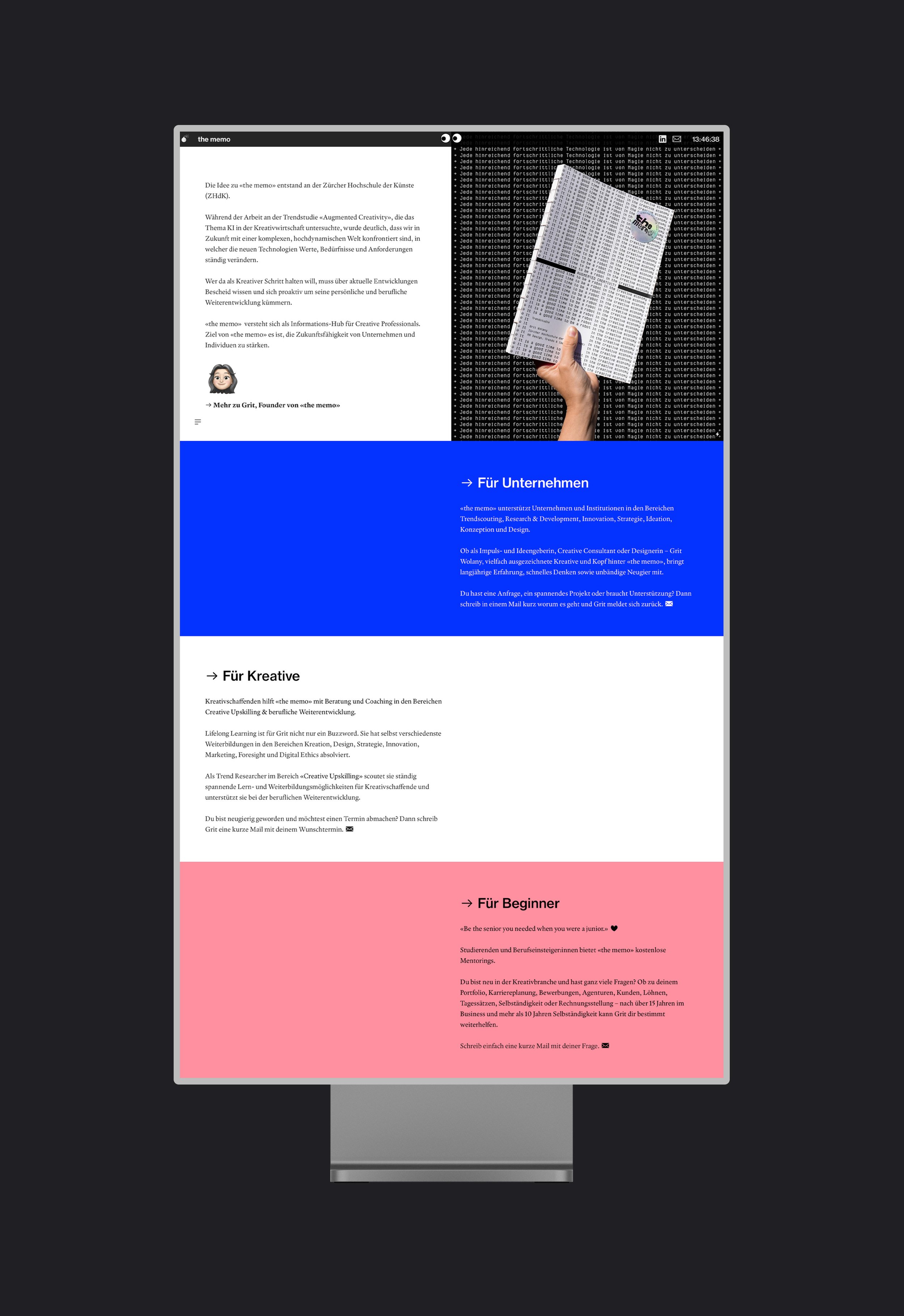Hier setzt das hybride Service- und Beratungsangebot «the memo» an. Nach dem Prinzip «Inform – Inspire – Empower» wirkt „the memo» an der Schnittstelle von Design, Technologie und Weiterbildung mit dem Ziel, die Zukunftsfähigkeit und das Upskilling von Kreativen zu stärken.
